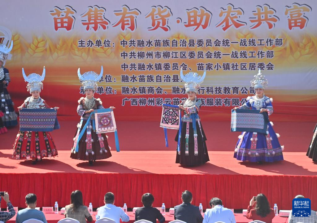 當日,廣西融水苗族自治縣融水鎮苗家小鎮社區舉辦第二屆“苗集有貨·助農共富”助農大集市,集市設立特色農產品區、手工藝品區、民族特色美食區、非遺技藝展示區等,對各鄉鎮的農特產品和非遺文化進行展示、展銷,促進鄉村振興產業發展。