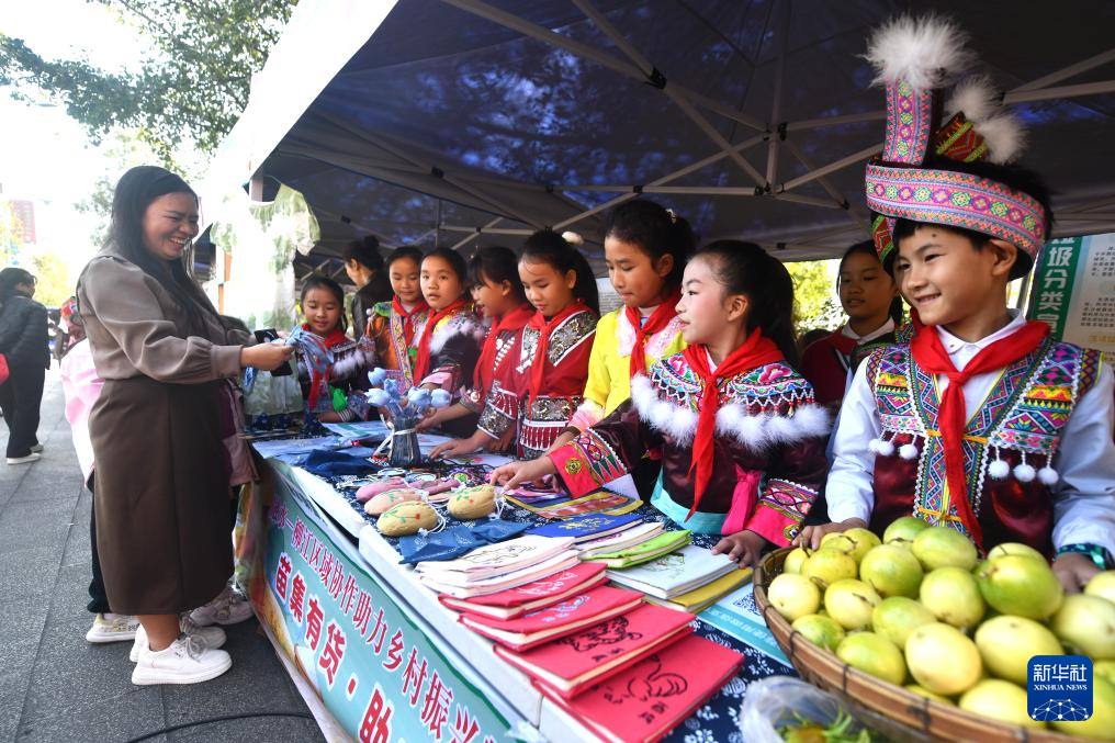 11月15日,在融水縣融水鎮苗家小鎮社區,小學生義賣農特產品和手工藝品。