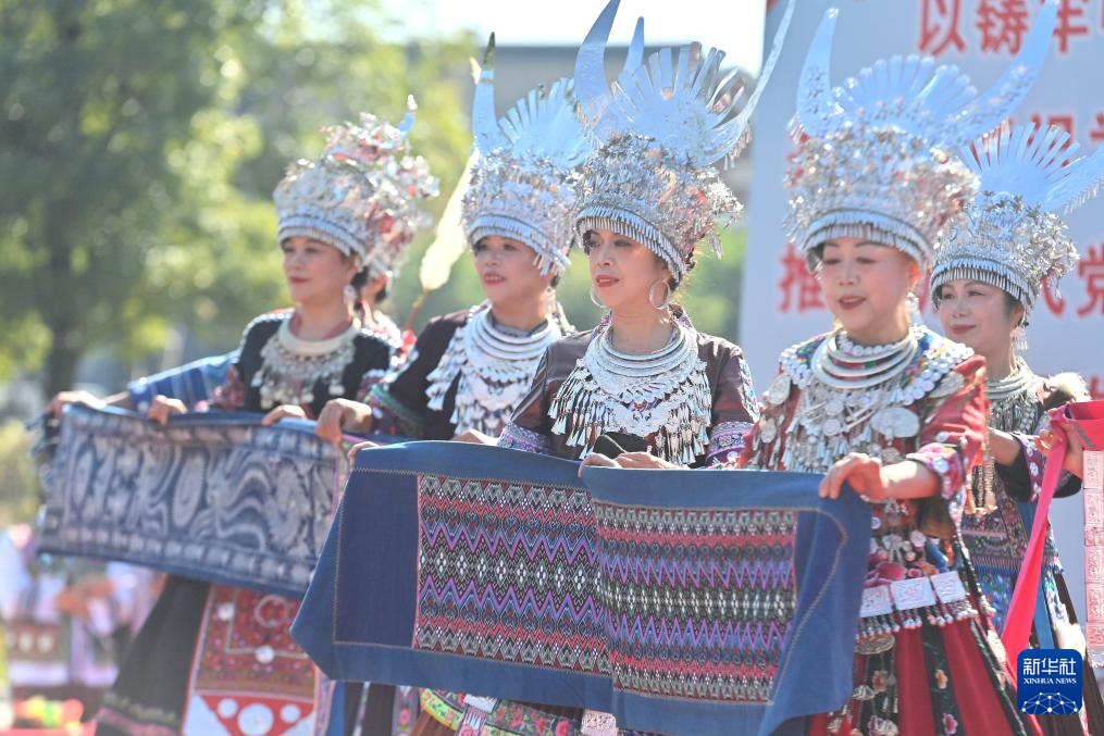 11月15日,在融水縣融水鎮苗家小鎮社區,演員展示苗繡和苗錦。