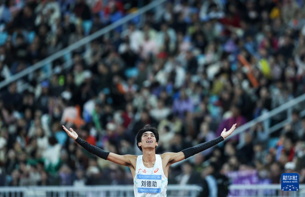 11月20日,廣西隊選手劉德助在沖線后慶祝奪冠。