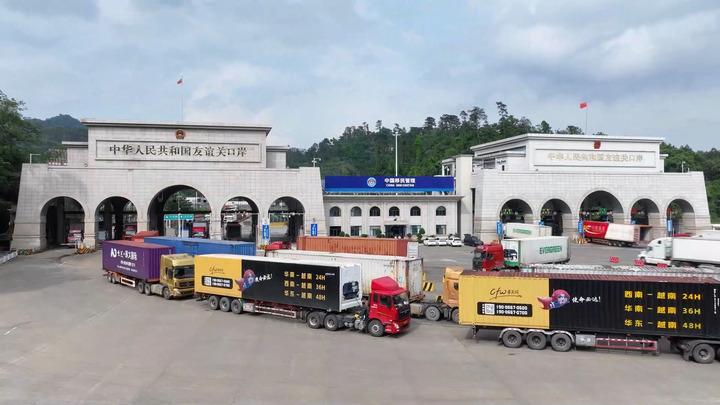 距離靖西市200多公里的友誼關口岸是中國面向東盟最大的陸路口岸之一。每天開關后,滿載跨境貨物的貨車在口岸有序排隊,等待通關。