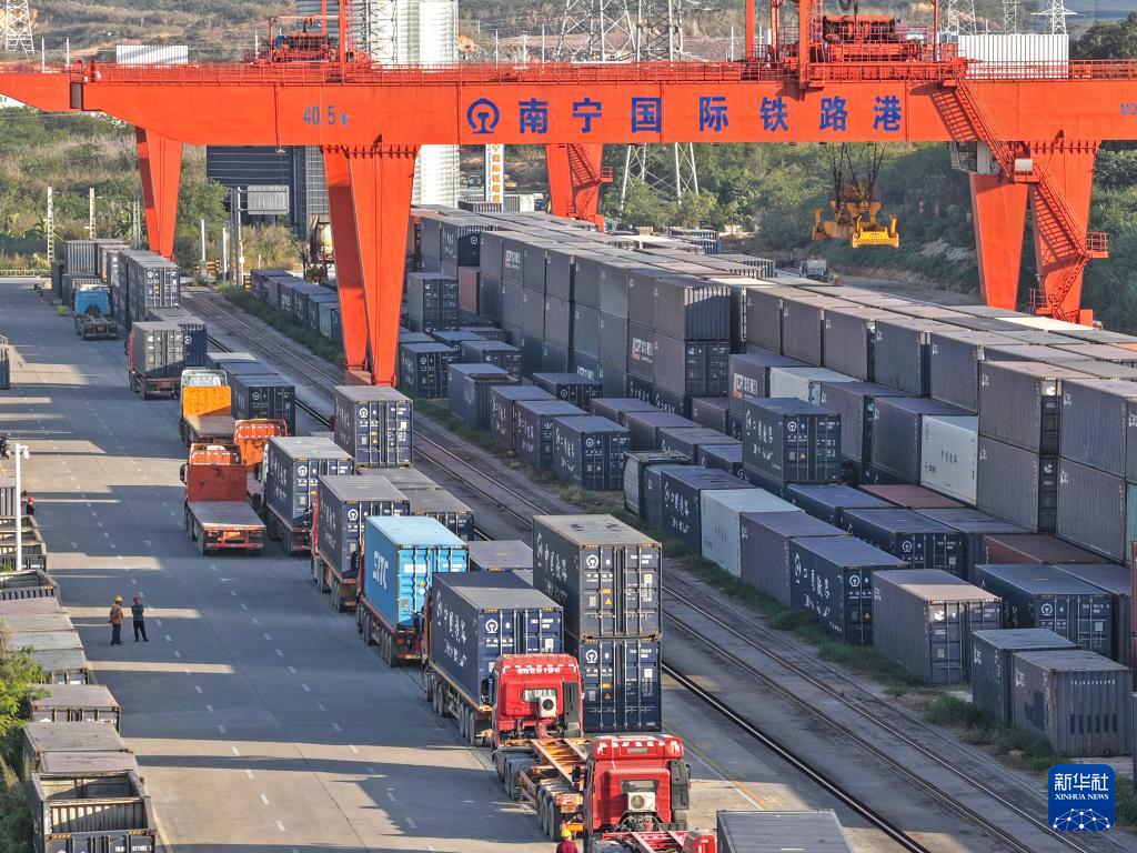 一列中越班列駛出南寧國際鐵路港(11月28日攝,無人機照片)。