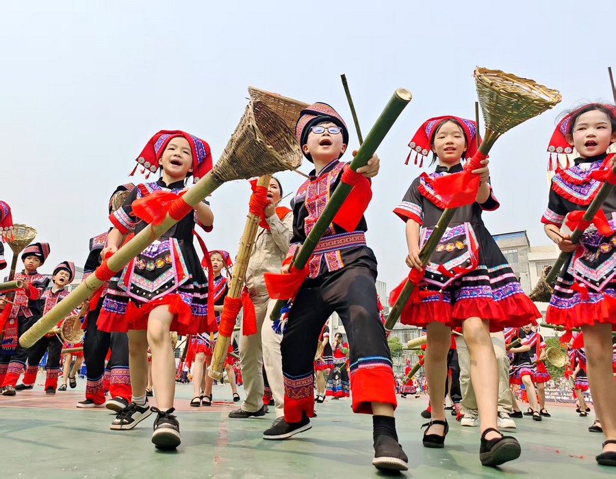廣西大化:師生同跳竹鼓舞喜迎“三月三”
