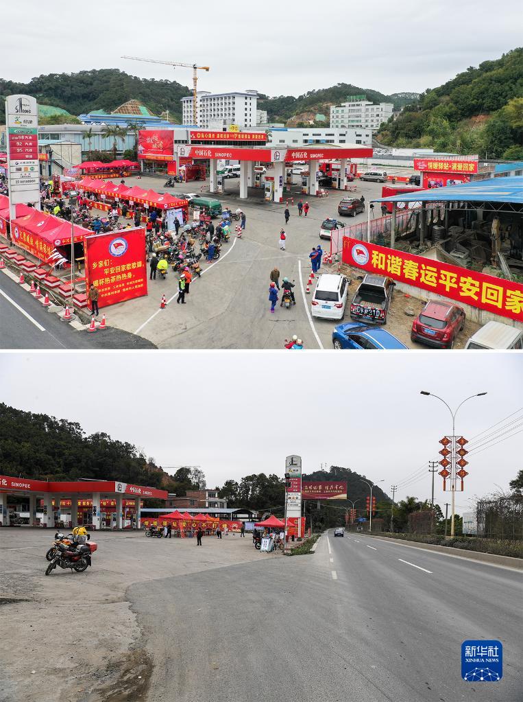 拼版照片:這是分別于2020年1月19日(上圖)和2022年1月26日拍攝的位于321國道梧州市東出口處的同一個春運愛心服務站,騎摩托車返鄉的在粵務工人員數量明顯減少。