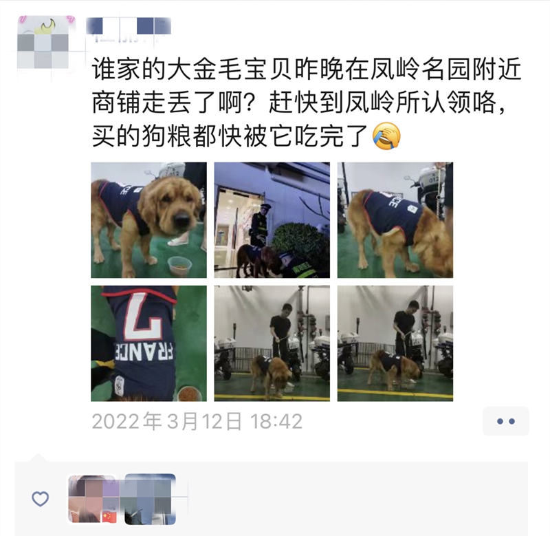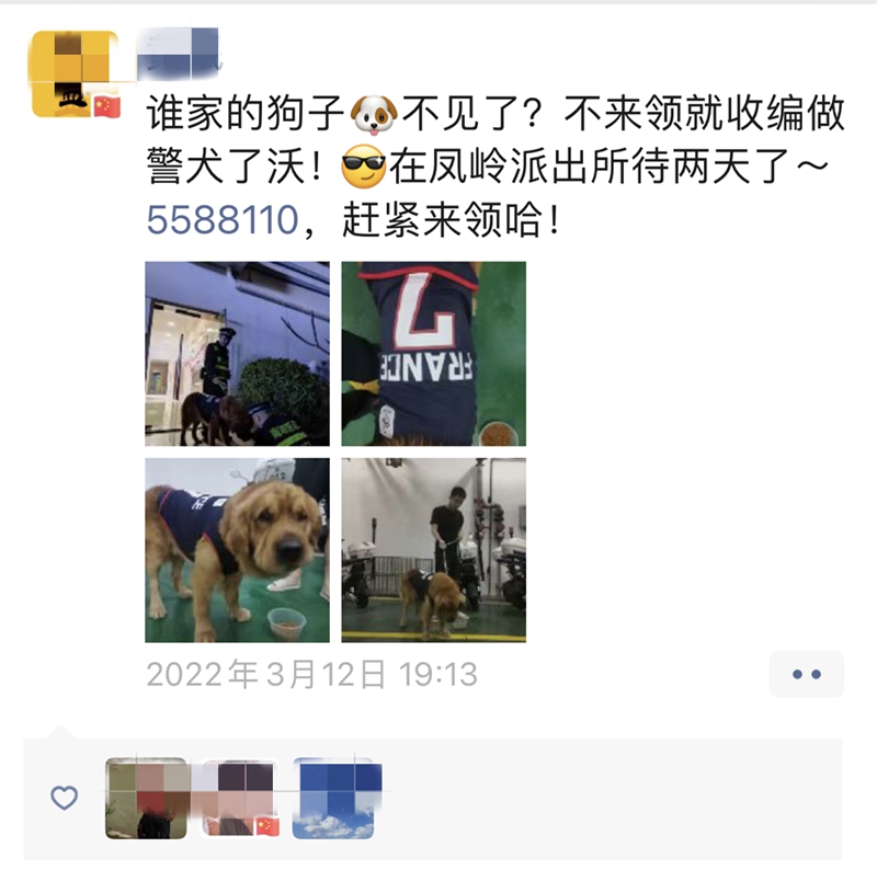 當日值班民警將小狗的信息發到朋友圈、小區微信群,同事、親友們紛紛留言轉發,一場特殊的接力“尋親”行動就此展開。