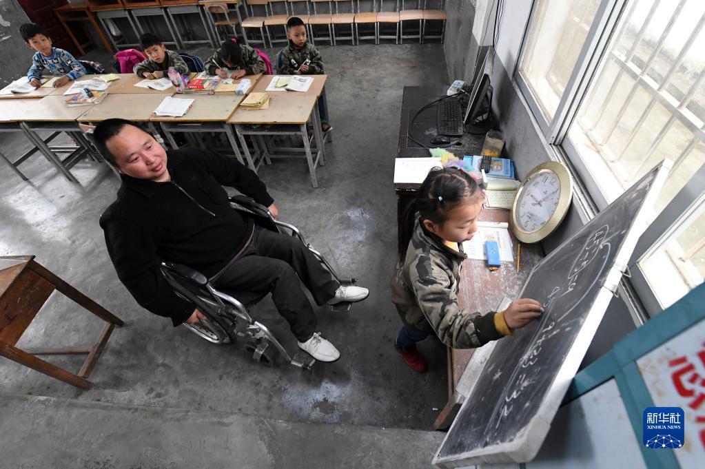 在廣西凌云縣下甲鎮河洲村念恩小學,殘疾老師阮文憑坐在輪椅上給學生上課(2019年3月26日攝)。