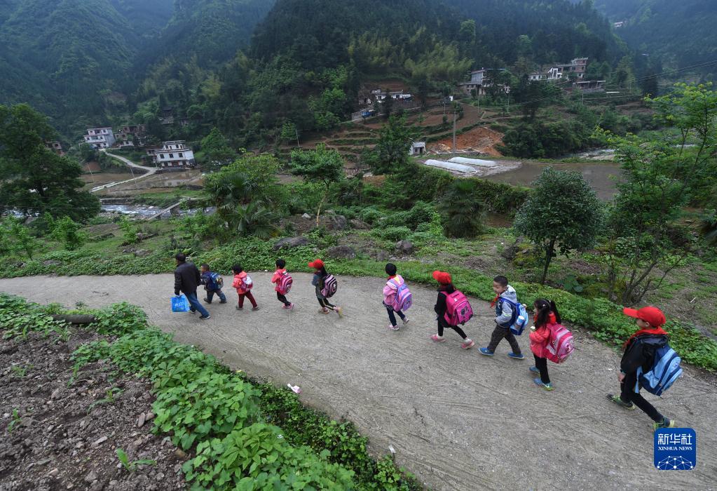 在廣西全州縣蕉江瑤族鄉大源村苦馬田教學點,學校唯一的老師盧加紅中午放學后護送學生回家(2016年4月28日攝)。