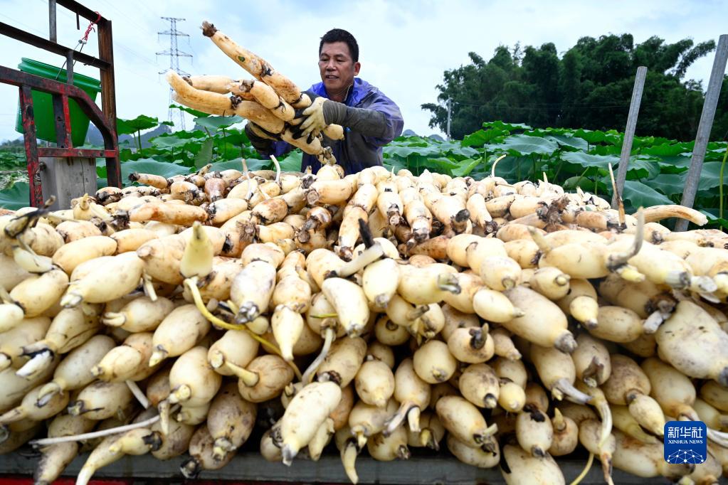 6月14日,廣西柳州市柳江區進德鎮龍新村,農民把剛采挖的蓮藕裝車轉運。