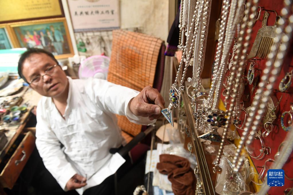 在廣西三江侗族自治縣古宜鎮,吳共能在工作室打量自己打造的銀飾(6月14日攝)。