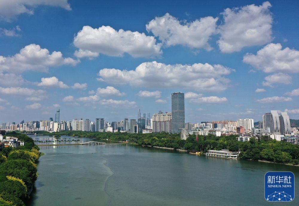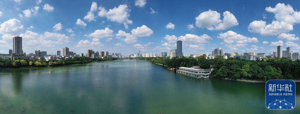 盛夏時節,廣西南寧市南湖公園在藍天白云的映襯下,湖面明凈如畫,湖畔綠樹成蔭,風光秀麗。