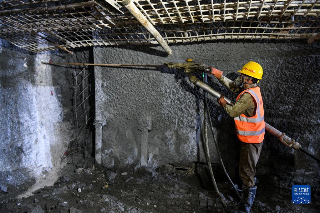 8月16日,在位于廣西環江毛南族自治縣的貴南高鐵九萬大山四號隧道內,工作人員用風槍打爆破眼。