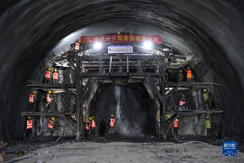 8月16日,在位于廣西環江毛南族自治縣的貴南高鐵九萬大山四號隧道內,工作人員在隧道掌子面施工。