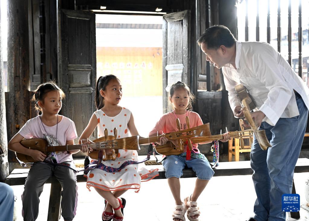 8月17日,在柳州市三江侗族自治縣林溪鎮冠洞村新時代文明實踐站,當地侗族琵琶歌非遺傳承人楊龔(右一)在鼓樓里教孩子們彈唱侗族琵琶歌。