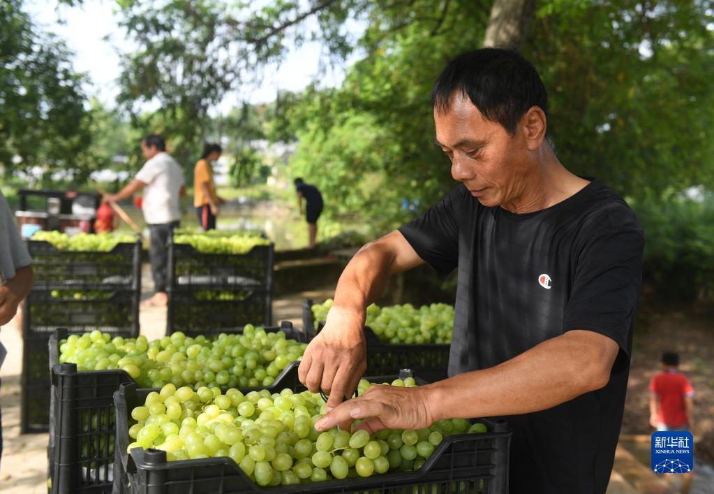 8月23日,在廣西全州縣才灣鎮毛竹山村,當地村民在分揀收摘的葡萄。