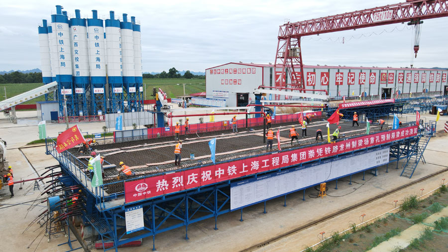 據悉,新建崇左至憑祥鐵路正線全長81.12公里,設計速度250公里/小時。由中鐵上海工程局承建的龍州制梁場位于廣西崇左市龍州縣,主要承擔崇憑鐵路CPZQ3標及先期標427孔箱梁預制生產任務。