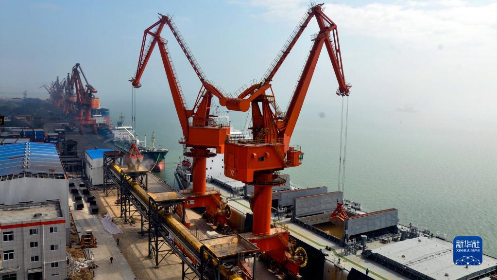 中糧油脂欽州項目5萬噸級專用碼頭全面建成,自動化裝卸設備投入使用(2012年7月9日攝)。