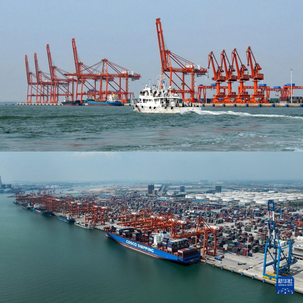 拼版照片:上圖為2010年的欽州港碼頭作業區 (2010年11月29日攝);下圖為2022年的欽州港碼頭作業區(2022年8月28日攝,無人機照片)。