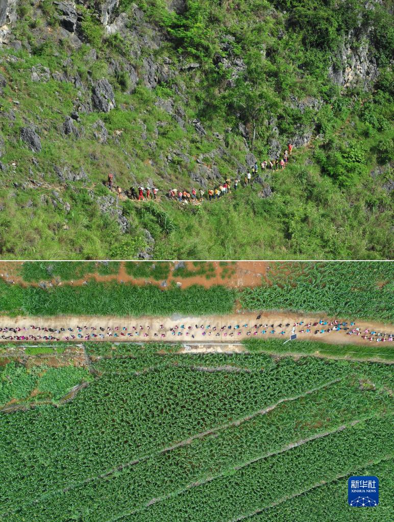 上圖:在廣西大化瑤族自治縣板升鄉弄勇村,孩子們扛著生活用具翻山越嶺回家(2012年7月4日攝);下圖:在弄勇小學大門口,孩子們走在放學路上(2022年5月20日攝,無人機照片)。十年來,弄勇村修通了多條公路,實現屯屯通公路(拼版照片)。