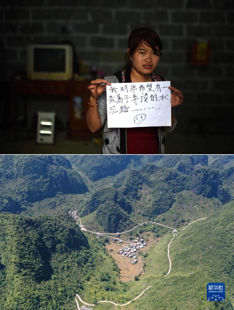 上圖:在廣西大化瑤族自治縣板升鄉弄勇村,村民藍春花展示村民們的“公路夢”(2015年2月14日攝);下圖:如今的弄勇村已經實現了屯屯通公路(2022年9月24日攝,無人機照片)(拼版照片)。