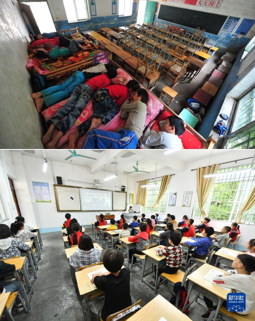 上圖:在廣西都安瑤族自治縣隆福鄉漁洞小學,孩子們在教室里睡午覺。那時候,教室也是宿舍(2012年5月30日攝);下圖:在漁洞小學,孩子們在寬敞明亮的多媒體教室上課(2022年5月26日攝)。近10年來,學校修建新的教學樓、宿舍樓、籃球場、食堂等,辦學條件得到極大改善。