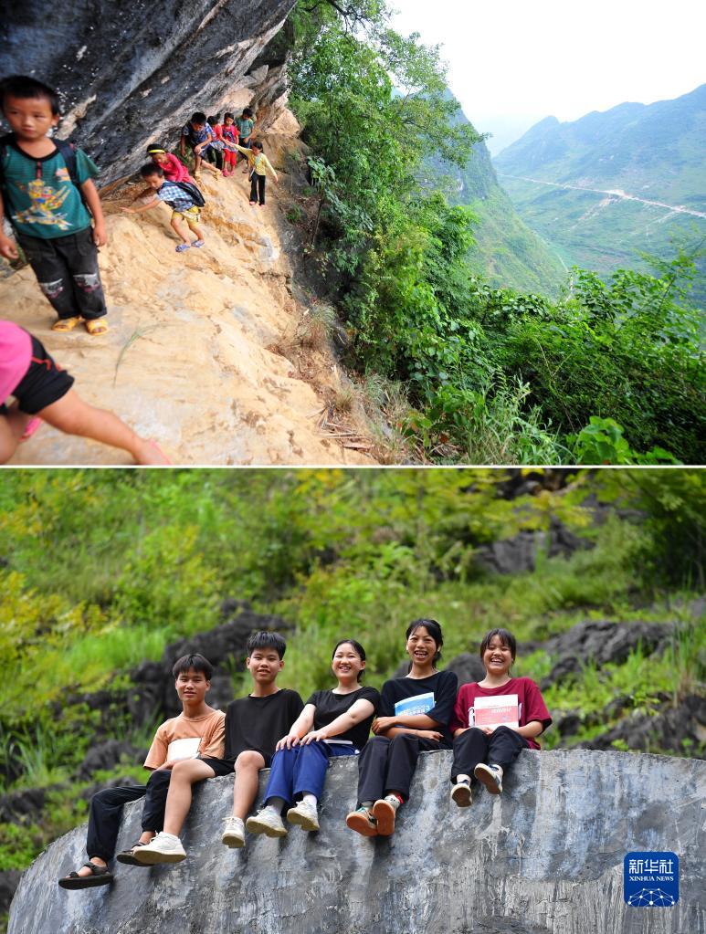 上圖:在廣西大化瑤族自治縣板升鄉弄雷村哈保屯,11歲的蒙秋艷(右一)在懸崖邊護著低年級的小伙伴回家(2012年9月3日攝);下圖:已經是廣西醫科大學大二學生的蒙秋艷(中)和小伙伴們在家門口合影(2022年8月23日攝)。10年前,弄雷村哈保屯有一處約300米長的半山懸崖,是屯里10多名小學生上學的必經之路。10年過去了,屯里的人早已搬遷到公路旁。當年爬懸崖求學的孩子們有的在讀高中,有的讀中專,有的考上了大學(拼版照片)。