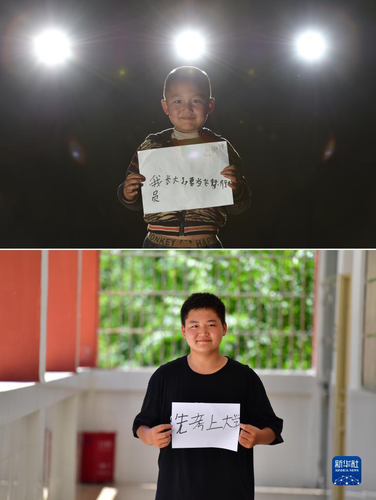 上圖:在廣西大化瑤族自治縣板升鄉弄勇小學,8歲的劉順杰展示自己的夢想(2015年1月28日攝);下圖:已經到縣城讀初中的劉順杰希望自己能考上大學(2022年7月26日攝)(拼版照片)。
