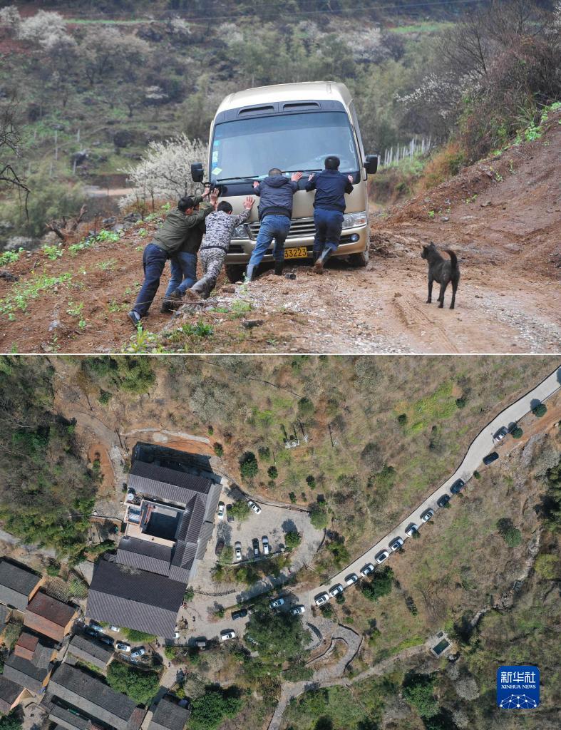 上圖:在廣西融安縣東起鄉崖腳村銅板屯,村民將汽車推出泥潭(2014年2月22日攝);下圖:汽車??吭阢~板屯的旅游公路上(2021年2月17日攝,無人機照片)。銅板屯曾是當地有名的“空心村”,一度只有6位老人留守,整個村莊瀕臨消逝。10年來,在當地政府的扶持下,返鄉青壯年實施“故鄉拯救計劃”,發展生態觀光旅游產業。如今,銅板屯面貌發生翻天覆地的變化,已成為當地的“網紅村”(拼版照片)。