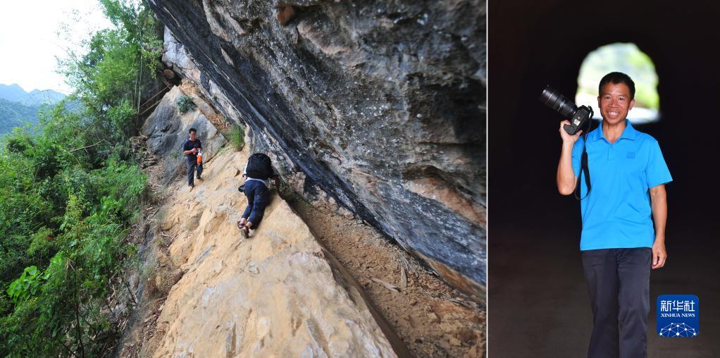 左圖:在廣西大化瑤族自治縣板升鄉弄雷村,縣委宣傳部工作人員韋哲(右)爬懸崖去采訪孩子們的上學情況(2012年9月3日攝);右圖:韋哲采訪途中經過一處公路隧道,如今的山區已經實現屯屯通公路(2022年8月23日攝)(拼版照片)。