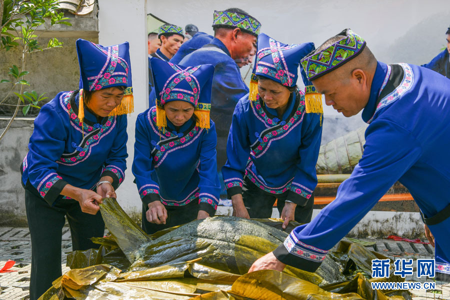 圖為村民正在打開用龍寫糯米制作的黑米大粽。龍寫大糯以其質白、粒粗、軟韌、香醇、口感極佳而聞名遐邇,暢銷區內外。(黃少將 攝)