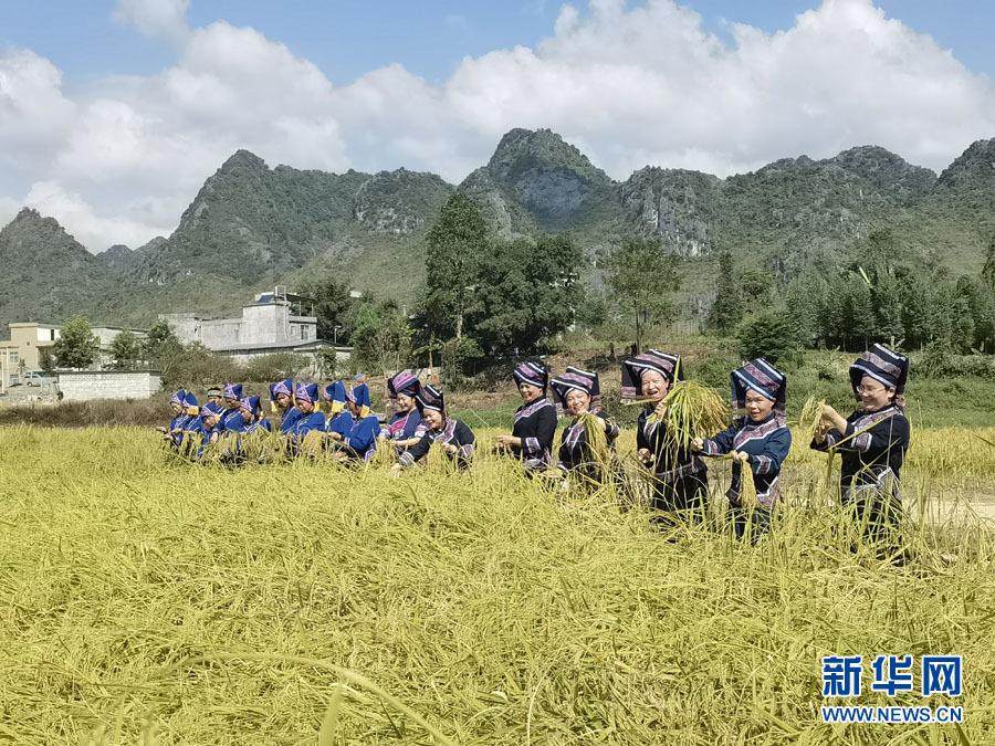 圖為壯族群眾在稻田間收稻谷曬土布。(黃少將 攝)