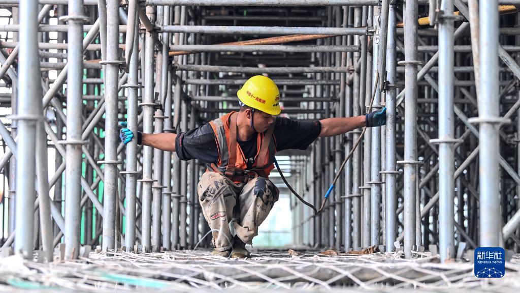 在玉林北站工地,工人在檢查安全防護網(11月27日攝)。