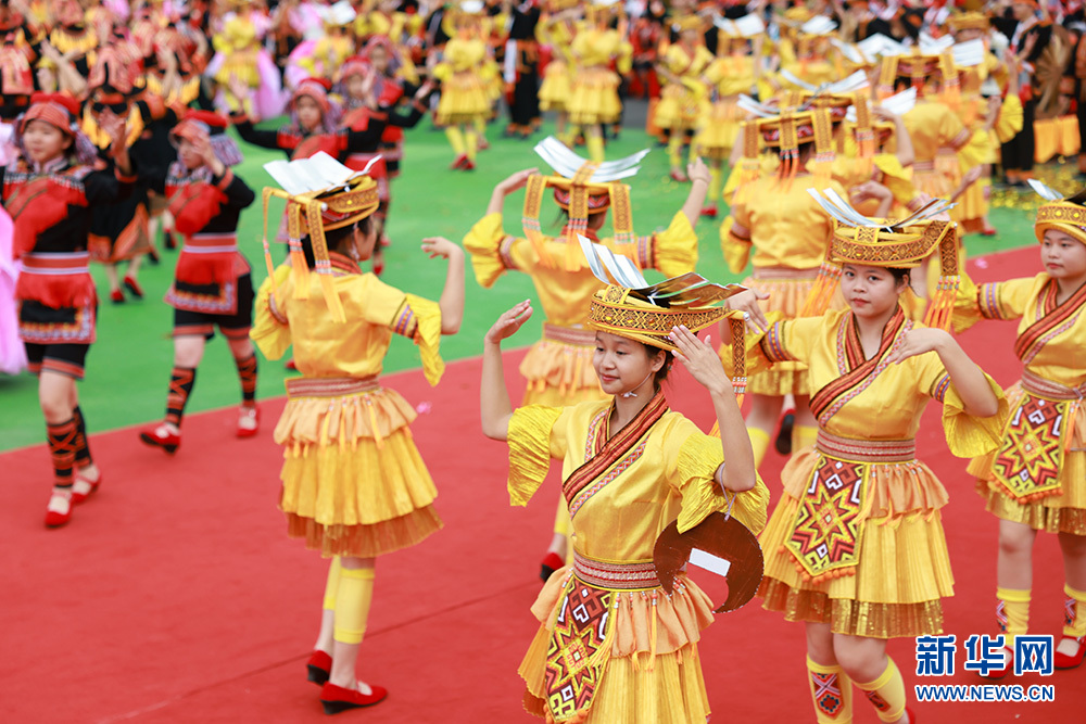 各族群眾載歌載舞喜迎金秀瑤族自治縣成立70周年。