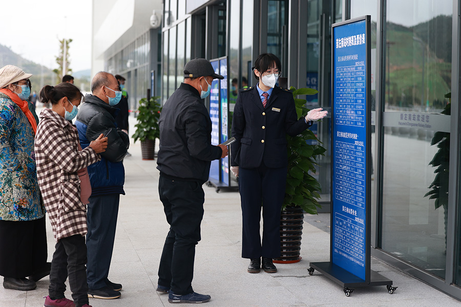 崇左南站客運員向旅客介紹列車運行情況(李伊 攝)