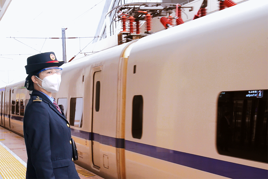 南憑高鐵南崇段首發列車D9688次在崇左南站開出,工作人員正在站臺上作業。(黃琪 攝)