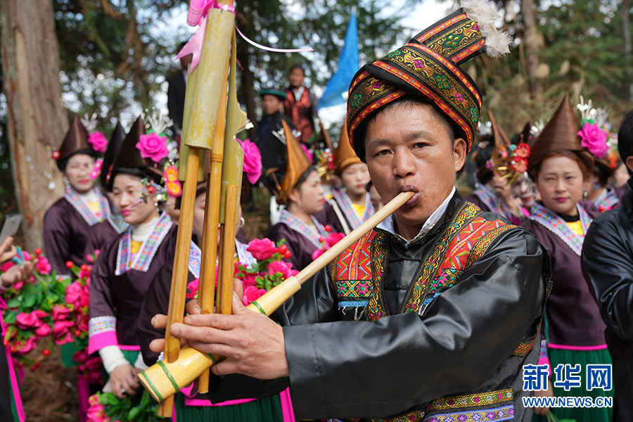 苗族男子吹奏蘆笙喜迎新年到來。新華網發 龍濤 攝