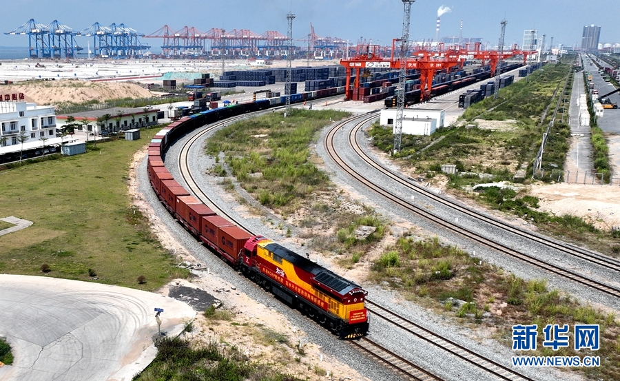 圖為正在行進的海鐵聯運班列。(新華社記者張愛林攝)