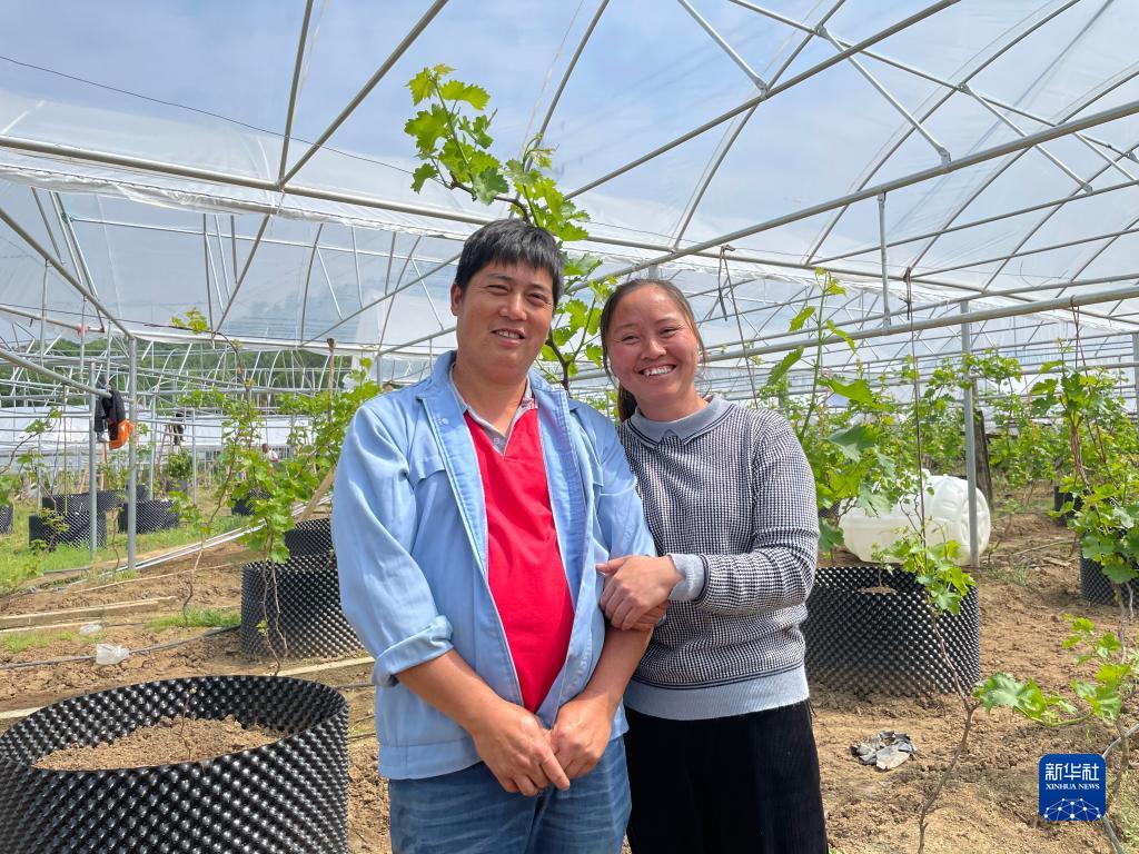 在自家葡萄種植園里的王德利夫婦(2022年4月攝)。新華社記者 王嘉偉 攝