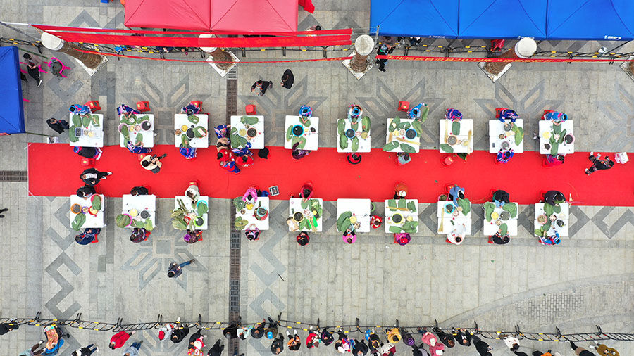 是你家菜香,還是我家菜征服更多人的味蕾?粽粑節還是一個美食的盛宴。社區組織了廚藝大比拼活動,伴隨著歡快的音樂,一道道色香味俱全、充滿美好寓意的菜肴從各家廚房拿到活動廣場,擺滿了兩條長長的桌子。大家圍著長桌以廚會友、以食為樂。當天,銅鼓舞、竹竿舞、山歌對唱等民俗節目也相繼上演。