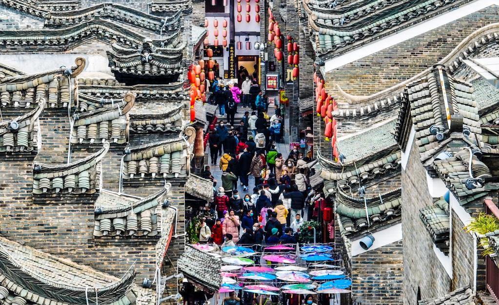 游客在廣西桂林市東西巷趕大集(無人機照片)。新華社發(劉崢攝)