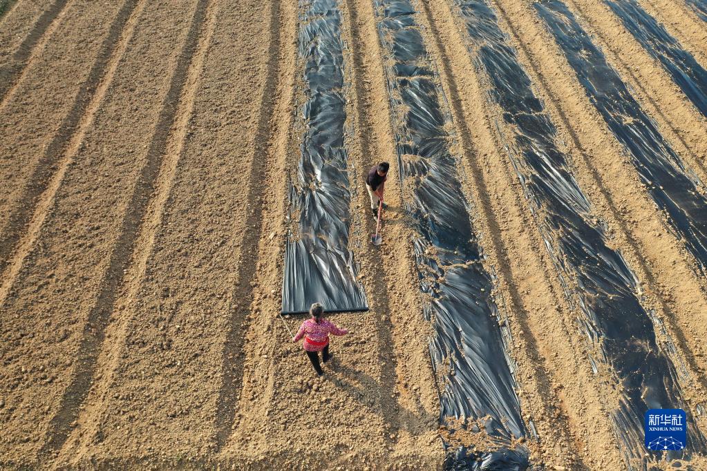 2月25日,農民在蒲廟鎮田園里鋪地膜(無人機照片)。