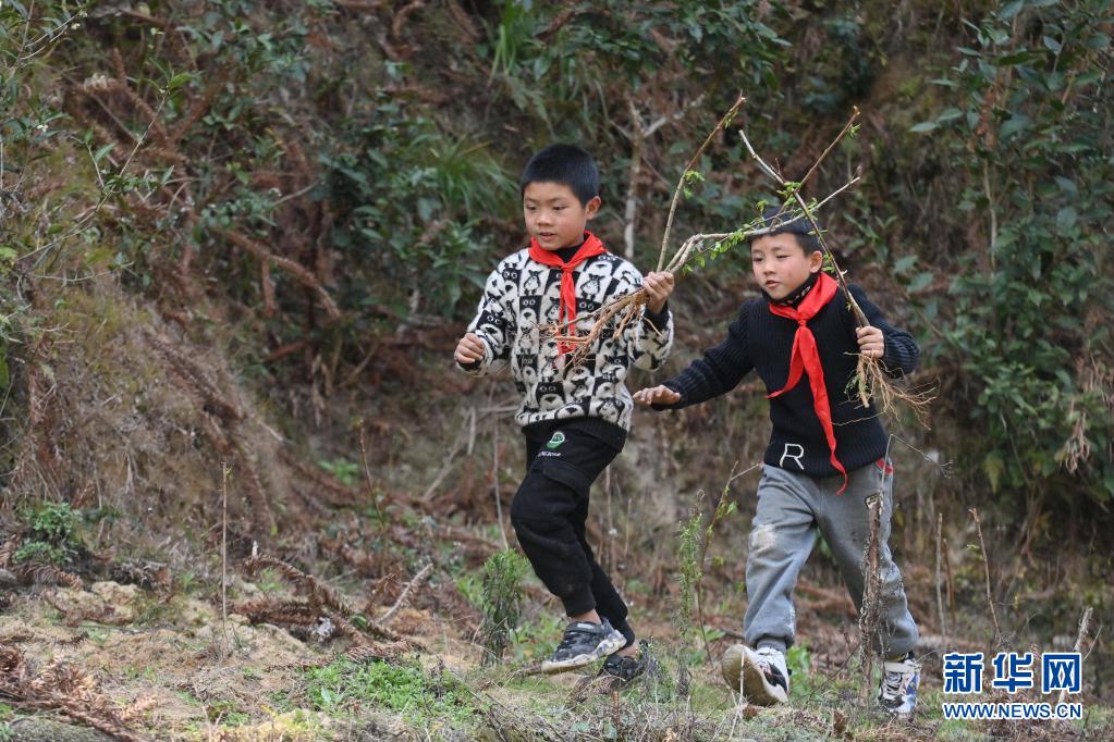 2月27日,在融水縣桿洞鄉黨鳩村,小學生拿著樹苗前往田間種樹。