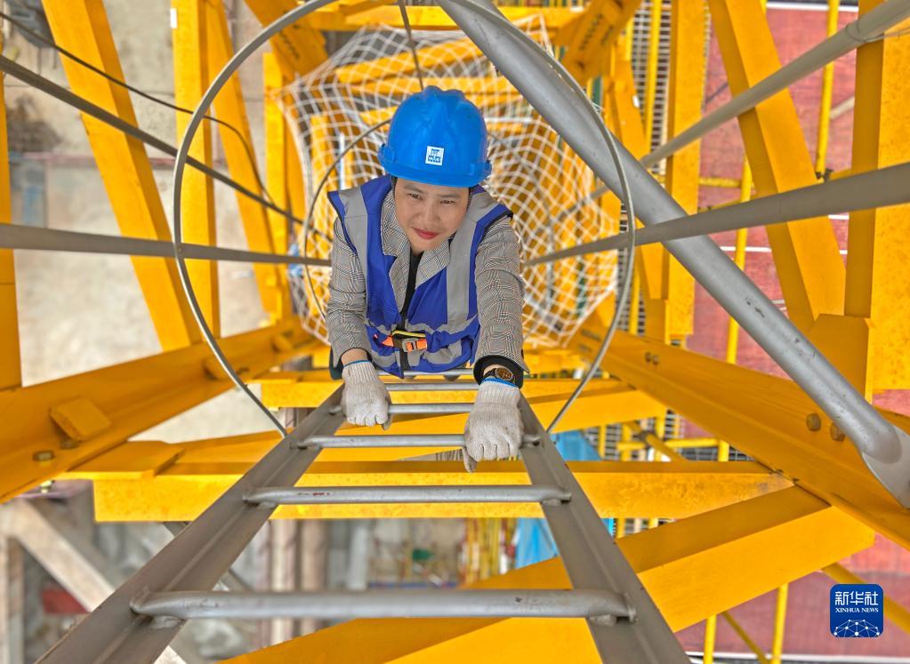 3月7日,在廣西南寧市良慶區五象大道中建三局一公司南寧中銀金融中心項目建設工地,覃桂英爬梯子,準備進入工作崗位。