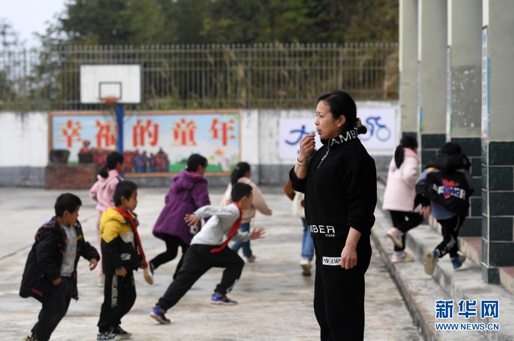 廣西金秀瑤族自治縣忠良鄉山界教學點的教師陶鳳英吹哨子催促學生進教室上課(3月15日攝)。