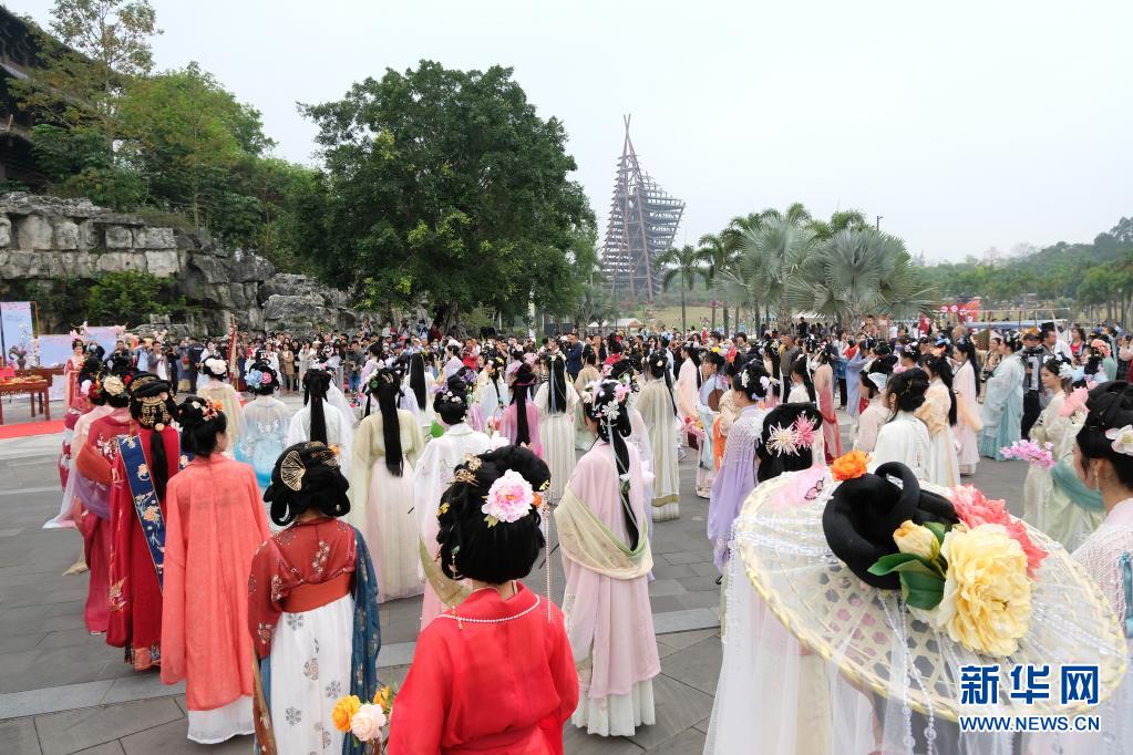 3月18日,身著古風服飾的人們在廣西南寧園博園參加花朝盛典活動。