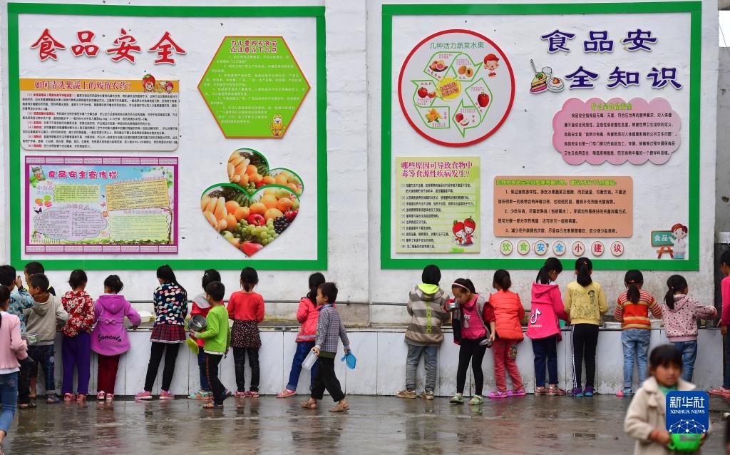 在廣西大化瑤族自治縣板升鄉八好小學,學生們用自來水洗碗(2023年3月20日)。十幾年前,學校僅有一個不足100立方米的水柜,用于收集儲存樓頂的雨水,學生用水要定期定量,遇到長時間不下雨,學校要到鄉政府所在地運水。2021年,當地抗旱應急供水工程投入使用,學校用上了十幾公里外的紅水河水,飲水難的問題得到徹底解決。