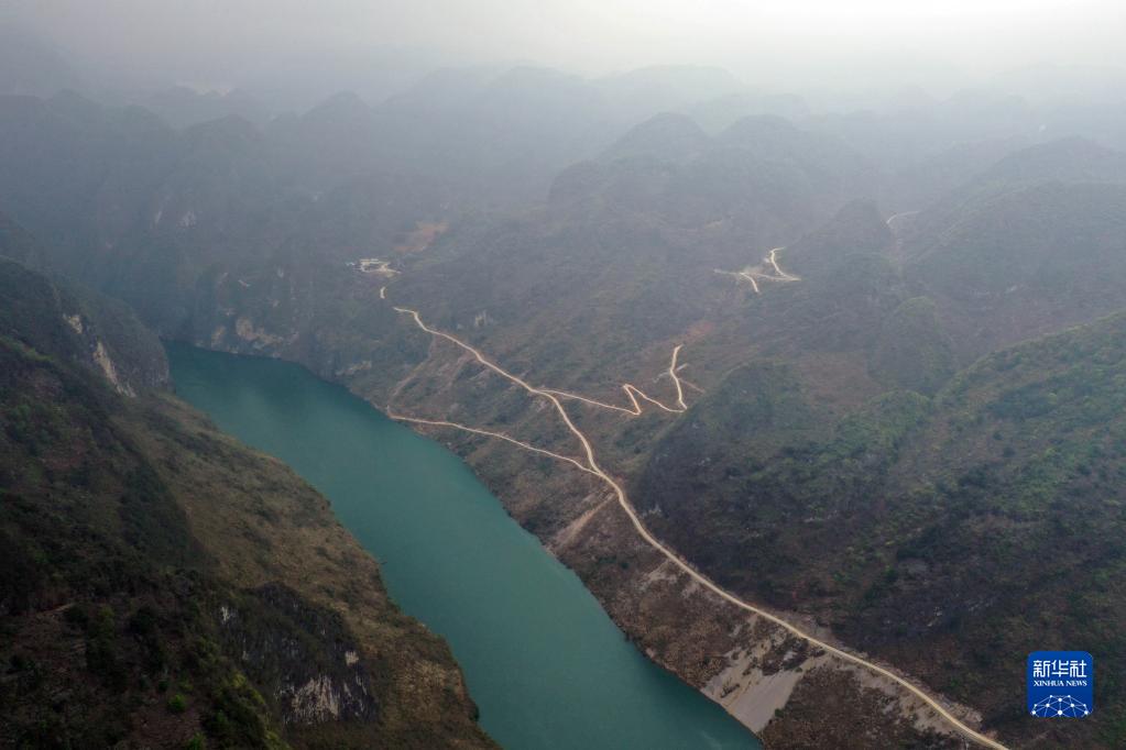 廣西大化瑤族自治縣板升鄉八好村抗旱應急供水工程水源取自紅水河(2023年3月20日攝,無人機照片)。