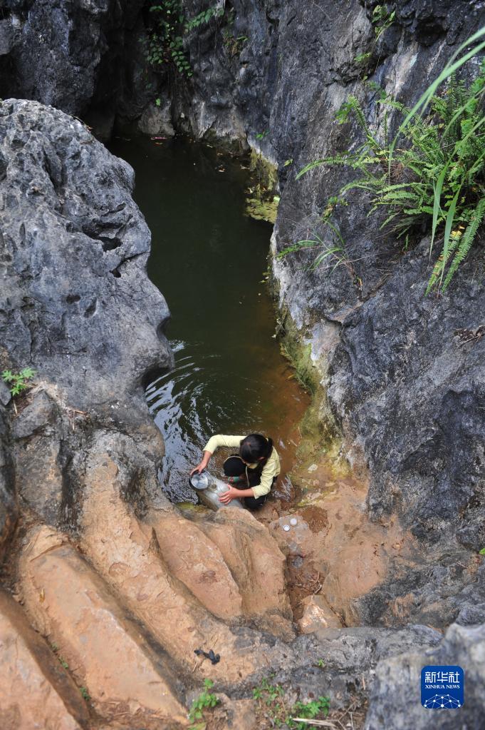在廣西大化瑤族自治縣板升鄉弄雷村,村民在山上一積水處取水(2012年9月3日攝)。