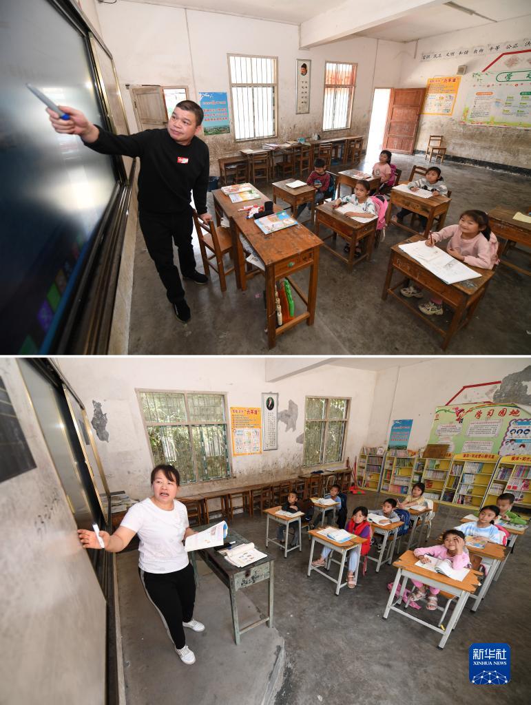 這是一張拼版照片:在廣西德??h東凌鎮那王小學,黃永勇(上圖)和黃秀碧(下圖)在給學生上課(3月22日攝)。