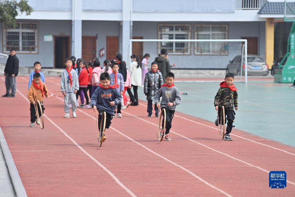 在廣西梧州市蒙山縣夏宜民族學校,學生們在體育課上滾竹環(2月22日攝)。