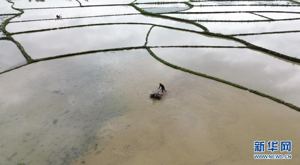 4月4日,廣西賀州市平桂區鵝塘鎮錦塘村農民操作手扶拖拉機犁田(無人機照片)。